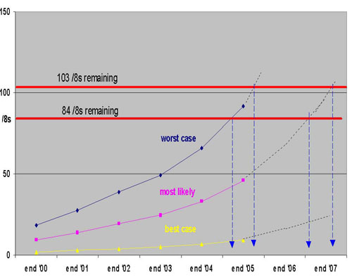 Why do the figures differ so greatly? One questionable factor in the ICANN estimates is that they assume only 103 blocks (about 1.7 billion) of Class A addresses remain today. This was the number of addresses remaining in IANA as of 2000, but in reality there seems to be considerable "stock" of addresses allocated to each RIR and NIC, which have yet to be assigned to users. On the other hand, statistics taken by ARIN have counted the number of addresses actually assigned by RIR to NIC, so its estimate (for the number of remaining addresses, 2.4 billion) seems more reliable. If other stocks at NIC and ISP are included, the number of remaining addresses is more than that shown by ARIN's data.