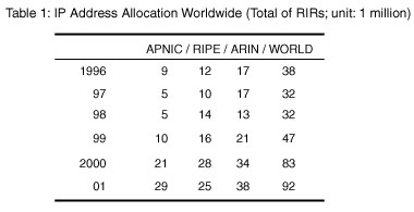 But that two-year period discussed represented extraordinary years that marked a peak in the worldwide Internet bubble, and therefore should not be used as a long-term standard. In fact, consumption in 2001 fell below that of the previous year for RIPE, and growth has also slowed for APNIC, notwithstanding the rapid increase in the number of Internet users in China and Korea. In addition, the world growth rate has fallen to 11 percent. For JPNIC in Japan, too, consumption has remained stable in the most recent five-year period, at about two million each year.